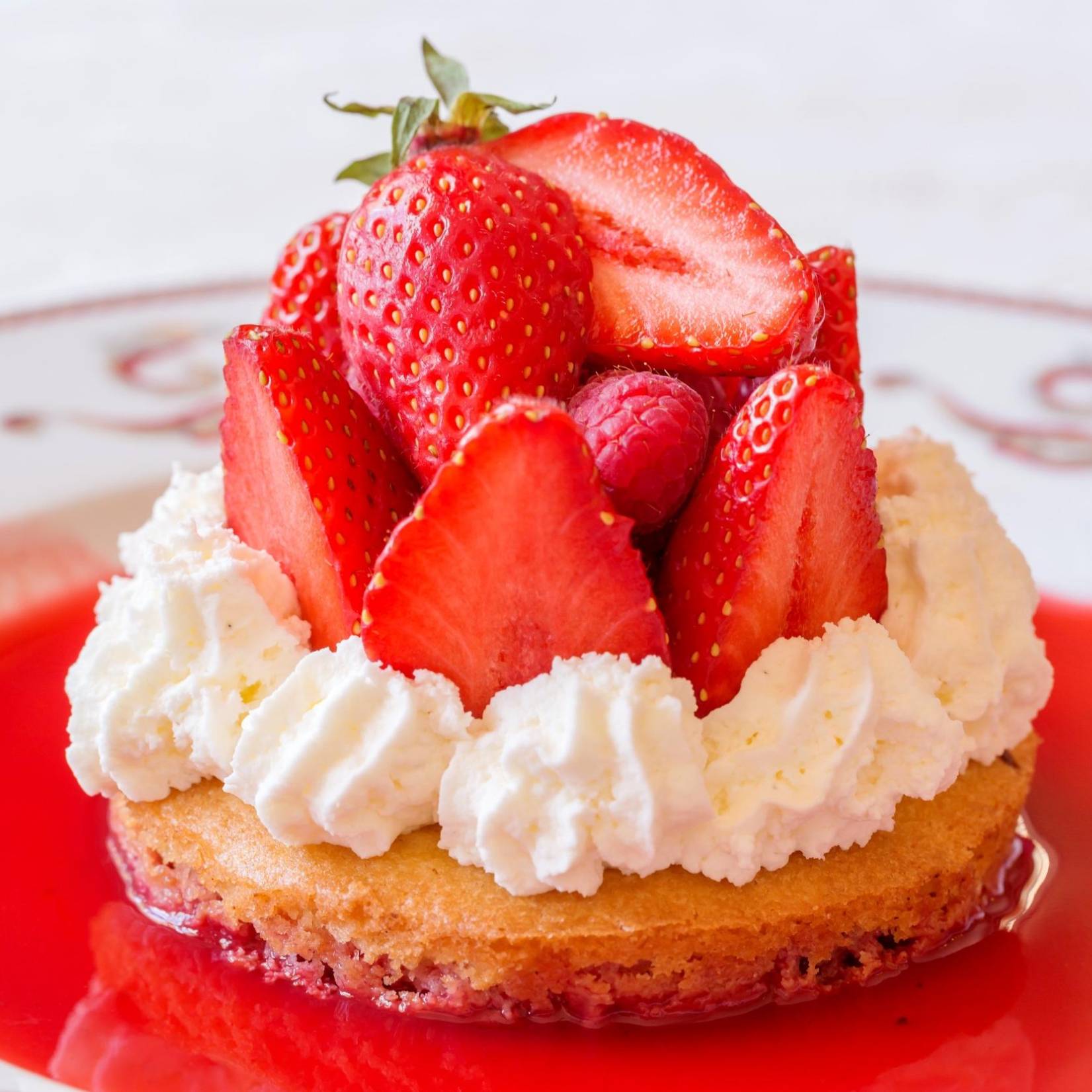 Pavlova glacée aux fraises, chantilly verveine, suc de fraises